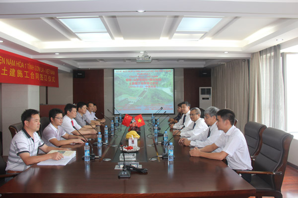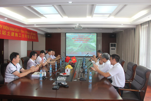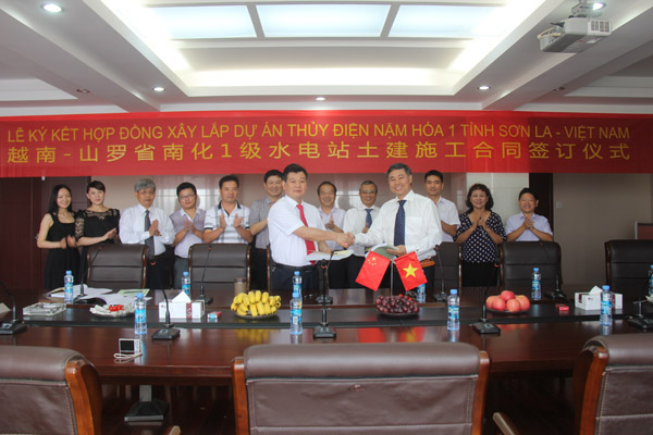 2013年7月22日,越南山羅省南化一級水電樞紐項目建設合同簽字儀式在我公司南昌市總部順利舉行,越南ANPHA水電投資股份公司董事長阮平陽和我公司董事長王元旦分別代表雙方簽署合同。出席簽約儀式的還有越南建設與機電股份公司(MECO)董事長阮玉平、ANPHA水電投資股份公司總經理陳重朵,我公司副總經理張周平、副總工程師鄒春明、項目經理夏愛民等。