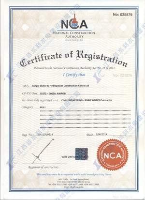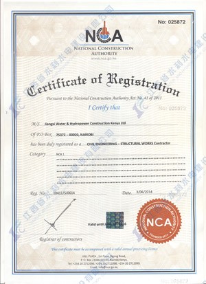 江西省水利水電建設有限公司肯尼亞分公司接到通告后,積極準備相關資料,憑借公司的技術實力和肯尼亞市場的良好業績,最終取得所有六項的一級證書。其中包括:水利施工一級,公路工程施工一級,房屋建筑工程施工一級,結構施工一級,電力工程施工一級和機電工程施工一級,有力地提升公司的品牌影響,提升了公司資信競爭力,為公司在肯尼亞各項工作的全面深入開展創造了積極有利的條件。